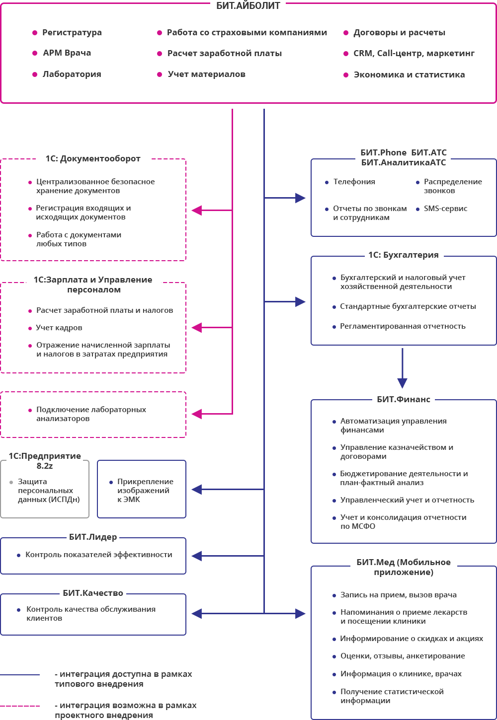 Конфигурация БИТ.Айболит разработана на базе платформы 1С: Предприятие, что дает возможность реализовать обмен данными между различными учетными системами. Наиболее часто встречается интеграция с такими решениями, как: